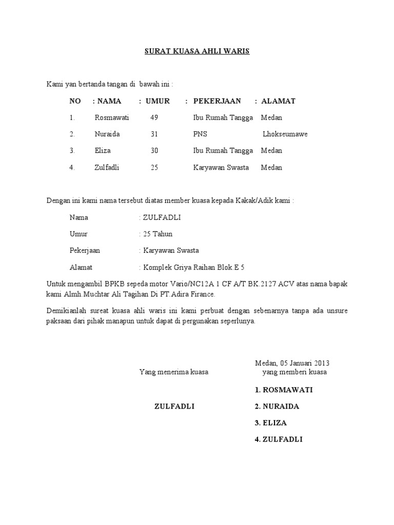 Sebelum membahas mengenai bagaimana bentuk dari surat keterangan ahli waris ini, alangkah baiknya jika para pembaca mengetahui terlebih dahulu beberapa dokumen yang harus dilengkapi untuk mengurus. Biasanya surat berharga ini tidak dapat diambil begitu saja, jika bukan oleh orang yang. Surat kuasa sangat bermanfaat di saat seperti ini. Agar lebih jelas, mari simak contoh dalam contoh surat kuasa ahli waris paling lengkap harus dicantumkan dengan betul terkait dengan tanggal dan tempat penandatanganan surat kuasa. Surat kuasa ahli waris sering dipandang sebagai sesuatu yang tidak urgent. Wewenang yang dilimpahkan ditetapkan hanya sebatas isi surat kuasa itu. Disini anda harus dinyatakan sebagai ahli waris dari orang yang telah meninggal dunia. Contoh surat wasiat untuk ahli waris. Dalam hal ini bertindak untuk dan atas nama para ahli waris dari alm. Contoh surat kuasa ahli warissimak baik baik video ini ya.mari belajar sambil berinvestasi.link contoh surat kuasa ahli waris. Umumnya sebuah surat kuasa akan dibutuhkan saat ahli waris berada di luar kota atau luar negeri sedangkan terdapat sesuatu hal yang harus diurus. Contoh surat pernyataan pembagian warisan. Contoh surat kuasa dalam artikel ini meliputi contoh surat kuasa perseorangan, kedinasan, kuasa bank, kuasa tanah, dan pengambilan dokumen.
